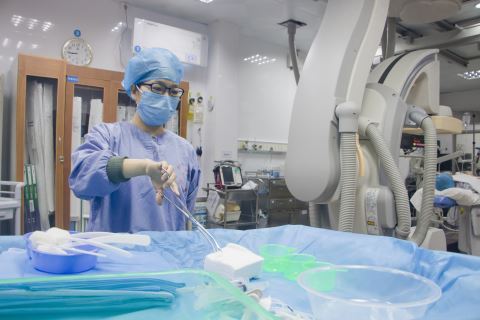 这样惊险的场景,随时可能在介入室上演。“像电除颤等抢救操作在病房主要是由医生操作的,但介入室的患者,大多数属于高危急性病,像急诊心梗患者,很可能合并心跳骤停、室颤等,这就要求介入室的护士也必须能够‘驾驭’各种抢救技能。”介入室副护士长洪晓华说。据了解,目前该科共有护理人员6名,均为十年以上工龄的资深护士,且有着丰富的ICU、CCU工作经验,年完成介入手术2400多台,涵盖心血管、脑血管、外周血管、肿瘤及大出血等介入手术。