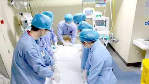 陈美珊护士长团队正在为患者进行俯卧式通气操作。
