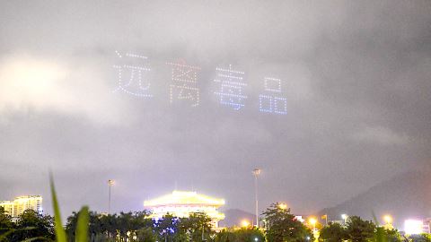 今年6月26日是第36个国际禁毒日。昨晚,一场禁毒宣传表演秀点亮揭阳楼广场上空,300台无人机编队通过展示“远离毒品”等图案,宣传禁毒教育。