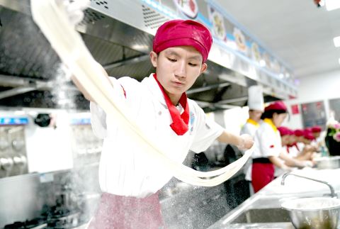 陕西省西安市蓝田县是著名的“厨师之乡”。蓝田厨师久负盛名、规模庞大。全县现有6万余人从事餐饮行业,足迹遍布全球30多个国家和地区。为进一步发挥蓝田厨师资源优势,培养更多厨师技能人才,蓝田县通过成立陕西省首家公办三年制烹饪专业中等职业教育学校——蓝田厨师学校,培养具有较高文化素养、艺术素养的一专多能的新一代厨师,让具有地方特色的职业教育拓展就业渠道,助力乡村振兴。图为6月25日在位于西安市蓝田县的蓝田厨师学校中式面点实训室,学生在练习制作面条。新华社 发
