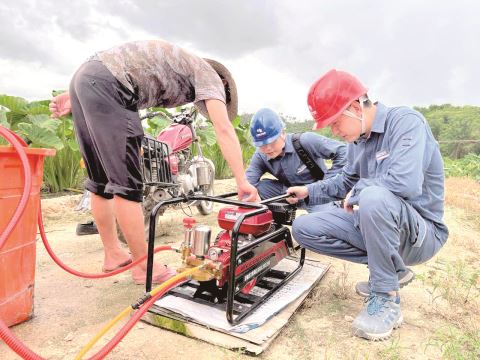 玉湖供电所工作人员对东寮村芋头栽培试验基地的设备进行用电安全检查。杨凯丽 摄