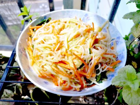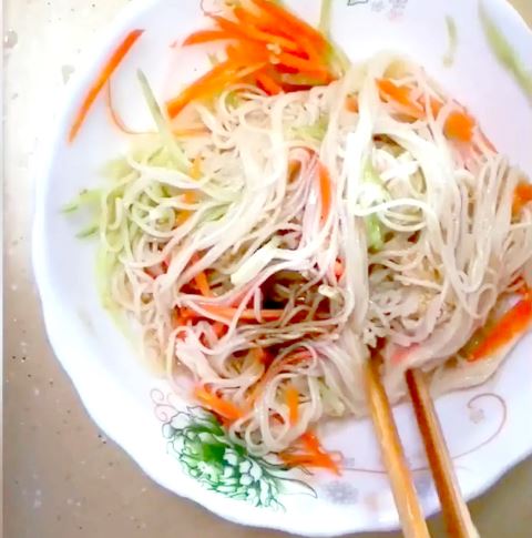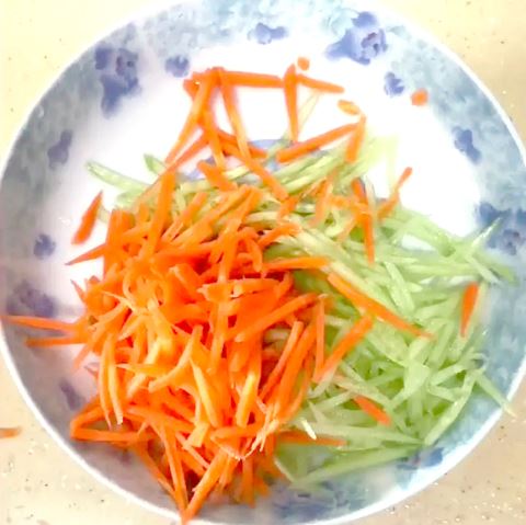 1.黄瓜、胡萝卜洗净去皮,抽丝。