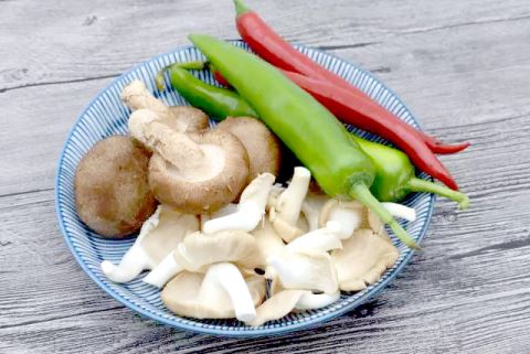 1.香菇洗净后切片,青辣椒切掉头后,用筷子掏去里面的籽,然后切成片,红辣椒洗净后切片,平菇洗干净。