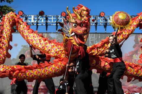 智利首都圣地亚哥13日举行盛大春节庆祝活动,为当地民众带来中国传统文艺表演、中国美食等多样体验,吸引上万名当地民众参与。图为1月13日演员在智利圣地亚哥举行的春节庆祝活动上表演舞龙。新华社 发