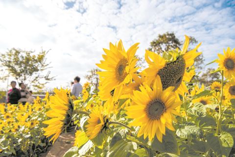 近日,榕城区明月公园附近的一片向日葵花海悄然绽放,朵朵葵花串连成金色的海洋。蓝天白云下,金色的向日葵花海与一旁的绿地相映生辉,犹如一幅美丽的风景画,吸引不少市民前来观赏,与花留影。