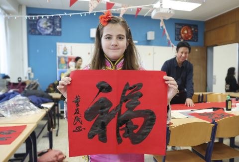 1月20日,在比利时布鲁塞尔,一名女孩在“中国日”活动上展示福字。当日,比利时欧华汉语语言学校2024年“中国日”活动在布鲁塞尔举行,通过写春联、送福字、剪纸等一系列丰富多彩的活动吸引众多中外学生前来参与体验,感受中国传统文化魅力。 新华社 发