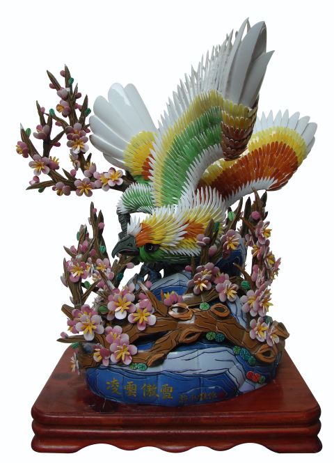 《凌云傲雪》立体摆件高51厘米、宽39厘米,是一件零距离四面可观的工艺品,展现的是傲立于梅枝之上的雄鹰,每一个细部都得做到位,大大小小每一片瓷片排列严密细致,层叠的纹路与走向十分自然,生动地呈现出雄鹰的雄健刚强,整件作品粗犷奔放,厚拙稳健,形神俱佳。不论是表现形式,还是制作工艺,都堪称为汕头嵌瓷艺术的上乘之作,作品获得“第五届广东民间工艺精品展(青年专场)”银奖。