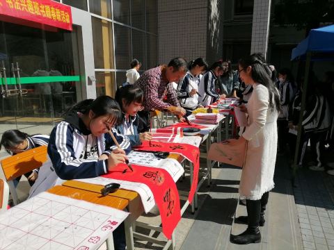 本报讯 (记者 徐剑萍) 新春佳节将至,为传承中华优秀传统文化,进一步加强学校“书香校园”文化建设,近日,普宁二中美术书法老师带领初中部第二课堂书法兴趣班同学共同为全校师生现场书赠春联、送“福”字(见上图。通讯员 摄)。