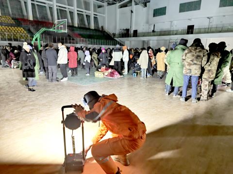 1月23日凌晨,国网阿合奇县供电公司工作人员在阿合奇县体育馆临时安置点架设照明设备。新华社 发