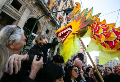 2月17日至18日,意大利罗马举行彩妆巡游、舞龙表演、书法体验等欢度春节的活动,吸引众多市民、游客前来体验中国文化,共同庆祝龙年春节。图为2月18日在意大利罗马,一名小朋友在彩妆巡游上观看舞龙。新华社 发