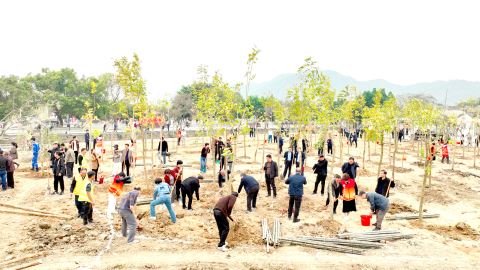 当天下午,在区级植树点仙桥街道西岐村,榕城区四套班子领导与镇村干部、党员志愿者、各界群众代表等150多人一起共同植树(见图。杨小琪 摄)。党员干部齐上阵,三五人成一组,有的挥动铁锹培实新土、有的扶正新苗木、有的夯实基土、有的提桶浇水,大家热情高涨,配合默契,干劲十足,现场一派热火朝天的劳动景象。通过大家的团结协作,新栽植的苗木错落有致、俊秀挺立,在和煦的春风中摇曳身姿,为榕城大地增添勃勃生机。
