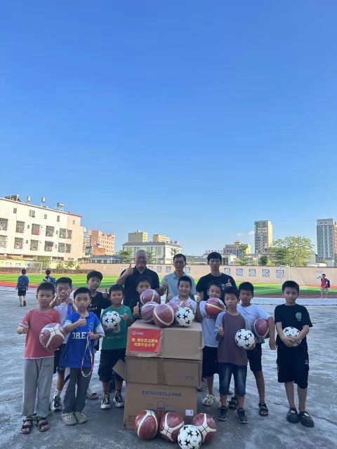 姚东深(后排左一)在揭东龙尾镇龙珠中心小学组建足球篮球社团,并联系东莞企业为学生捐赠体育器材。通讯员 摄
