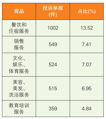 1.餐饮和住宿服务投诉举报的情况显示,涉及的服务主要有餐馆服务、小吃店服务、宾馆住宿服务等。主要反映问题:一是吃住卫生问题堪忧;二是食品变质、含有异物及感官性状异常等安全问题;三是营业相关证照配备不全;四是服务质量存在虚假宣传、不履行优惠承诺、捆绑销售、违规收取餐位费等问题。