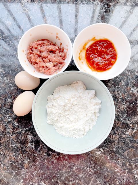 鸡蛋、面粉、猪肉糜。