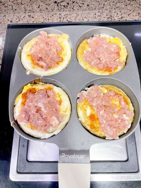 2.煎蛋锅先喷油,打入鸡蛋,待鸡蛋煎熟后放入肉馅,煎熟后抹上酱料盛出。煎锅倒入少许面糊,放入煎好的鸡蛋肉馅,轻压使面糊包裹住四周,在一面煎好后再倒入面糊煎另一面,煎的过程全程用小火,并勤翻面,煎至两面呈金黄色即可。
