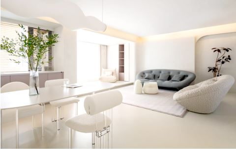 客厅以奶白色调为主,营造出清新、明亮的氛围,弧形元素增加了整个空间的柔和感与流畅感,让人感到宁静和舒适。