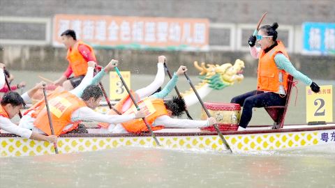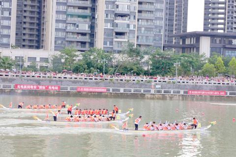 万人齐聚揭西城,百舸争流荡榕江。当天,鼓声阵阵,挥桨激浪,揭西县城榕江河婆段两岸人声鼎沸、熙熙攘攘,端午氛围立刻拉满了。在龙舟邀请赛开赛之前,首先来了一场龙狮表演,翩翩起舞的龙狮在空中回旋跳跃,展现出飞速奔腾的气势;随后的龙鼓表演集音乐、舞蹈、表演于一体,舞出了对未来生活的美好期盼;再来一场水上飞人表演,表演者把翻、转、跳、跃等动作融为一体,让观众充分感受水上运动的激情,为大家带来无穷的乐趣。暖场之后,8支知名龙舟参赛团队划过主席台,博得了现场观众阵阵掌声和欢呼声,这些共同组成了一幅幅生动多彩的端午画卷。