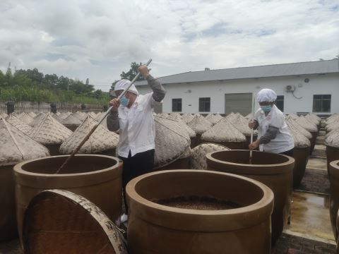 盛夏6月,走进坐落于揭西县五经富镇富洋路大洋山下的百年元合(广东)食品有限公司(以下简称“元合公司”),空气中弥漫着浓浓的酱香味。在酱油晾晒工场,几百个盖着锥形“帽子”的大瓦缸整齐地摆放着,几名工作人员逐一打开“帽子”,对着酱缸里已经发酵变成黑褐色的黄豆进行搅拌,经过一道道传统而严谨的酿造工艺,它们将实现华丽变身,成为浓香醇厚的酱油。
