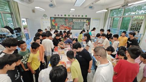 教室里,课桌拼接而成的长桌上摆满了学生们亲手制作的各类美食。各班或以小组为单位进行美食制作,或以个人为主烹饪拿手菜品。应邀而来的家长代表和老师代表担任美食团评委,在进行品尝后为各小组的作品打分。品评后,各班老师带领同学们一起了解了中华美食的文化内涵,教育同学们要养成健康科学的饮食方式。随后,各班邀请学校行政人员、科任老师前往教室共同品尝美食,教室里热闹非凡,一派和谐欢乐景象。该校美食节活动的举行,让学生们在实践中感受到平凡生活的美好,在合作中增进了同学情谊,提升了学生的自信和审美能力,增强了学生的劳动意识和社会责任感。