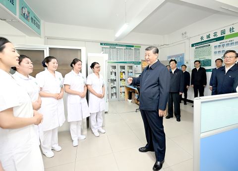 6月19日至20日,中共中央总书记、国家主席、中央军委主席习近平在宁夏考察。这是19日下午,习近平在银川市金凤区长城花园社区党群服务中心社区卫生站同医务人员亲切交流。 新华社记者 谢环驰 摄