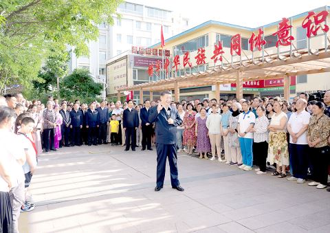 傍晚时分,社区广场十分热闹,居民们看见总书记来了,纷纷围拢过来,热烈鼓掌欢迎。习近平亲切地对大家说,时隔4年,我再次来宁夏看望各族干部群众,见到大家非常高兴!中华民族是一个大家庭,各族人民要像石榴籽一样紧紧抱在一起。要不断铸牢中华民族共同体意识,把各族人民的心紧紧连在一起,把各方面的力量广泛凝聚到一起,共同推进中国式现代化,共襄中华民族伟大复兴的盛举。