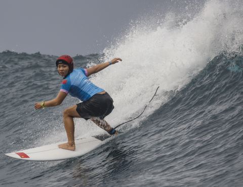 经过两轮比赛,巴黎奥运会冲浪项目28日决出男、女16强。中国首位奥运冲浪选手杨思琪在当天的第二轮比赛中取胜,成功晋级。图为7月28日杨思琪在比赛中。新华社 发