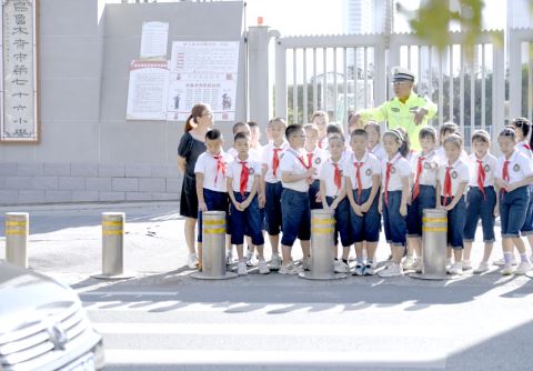8月26日,乌鲁木齐市公安局交警支队水磨沟区大队民警向乌鲁木齐市第七十六小学学生讲解交通安全知识。当日,乌鲁木齐市各中小学校迎来开学季,乌鲁木齐市公安局组织校园安全教育活动,为学生上好开学“安全第一课”,帮助学生增强安全意识,提高自我保护能力。新华社 发
