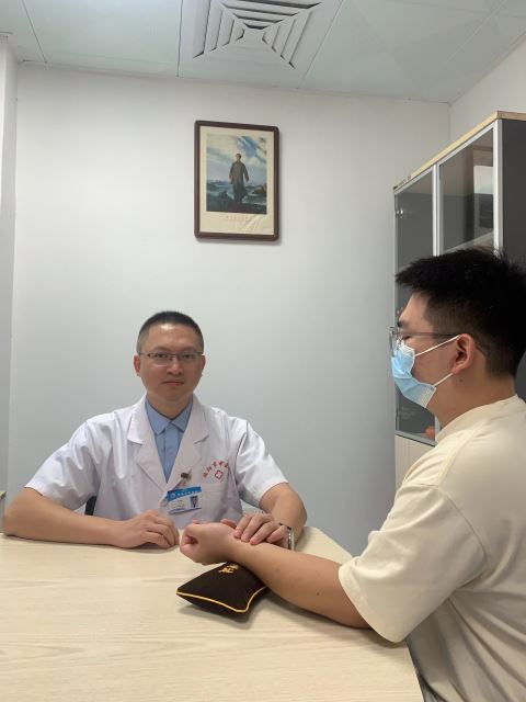 谢伟鑫正在给患者把脉。通讯员 摄