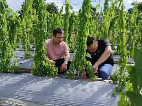 胡煜东(左)与农户在查看作物种植情况。通讯员 摄