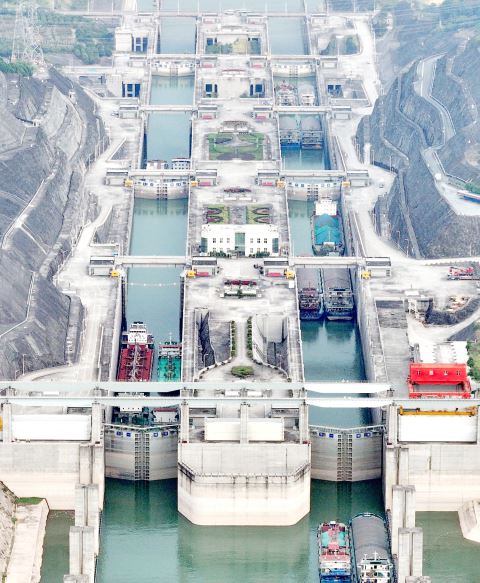 9月10日,在湖北省宜昌市,船舶有序通过三峡枢纽双线五级船闸(无人机照片)。据中国长江三峡集团消息,截至9月3日,三峡船闸今年共计运行6500余闸次,过船2.4万艘次,过闸货运量突破1亿吨。三峡船闸保持高效运行,连续11年实现货运量突破亿吨。新华社 发