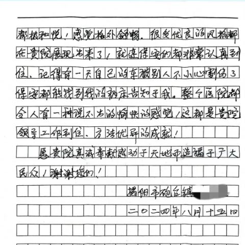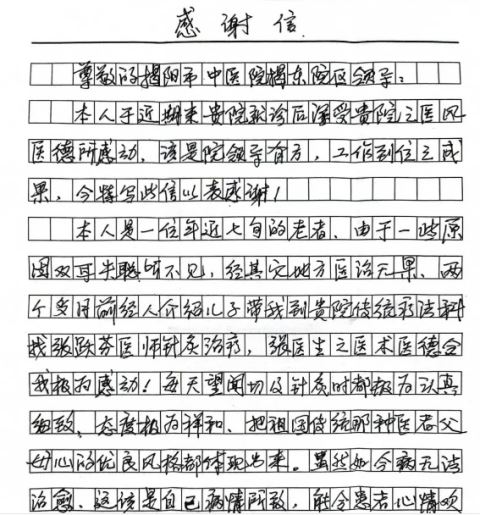 日前,揭阳市中医院揭东院区传统疗法科收到患者洪大叔寄来的一封感谢信,信中表达了他对医院和科室人员的感谢,他在信中写道:“本人于近期来贵院就诊后深受贵院之医风医德所感动,该是院领导有方,工作到位之成果,今特写此信以表感谢!”“整个医院都令人有一种说不出的愉快的感觉……”原来,洪大叔住院期间,传统疗法科医生张跃芬及医护人员和医院其他工作人员每天辛勤的付出、认真的态度他看在眼里、记在心里,在顺利出院归家之际,洪大叔难掩感激之情,写下了这封感谢信。