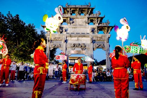10月3日,人们在安徽省黄山市黟县西递镇观看非遗花灯表演。