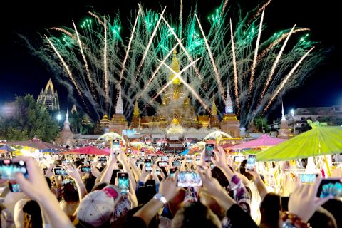 10月4日,游客在云南省西双版纳傣族自治州景洪市告庄西双景景区观赏国庆烟花秀。 新华社 发