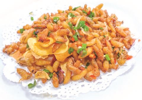 蜂虾营养丰富,风味酥香脆嫩,且有多种食法。蜂虾可以油炸炒食,也可以椒盐和浸泡药酒,还可以做汤和清蒸,做法可谓多种多样。蜂虾在制作成各式美味佳肴前,都得用钳子将蜂虾从蜂巢中取出,捡去杂质,先开水烫过,再用清水漂洗滤干,之后进行烹饪。椒盐蜂虾的做法是在锅中放油加热,油温要控制好,可用一根筷子竖放到油中测试,当筷子边上冒起小泡泡即可放入处理好的蜂虾,用文火把蜂虾煎炸至金黄色,捞起沥油。再将热油盛出,鼎中留下少许油,放点葱花、红辣椒碎炒香,加入蜂虾、少许椒盐,翻拌均匀便可装盘食用。这道菜,色泽金黄、香气扑鼻,蜂虾外脆里嫩、咸香鲜甜、味美可口。