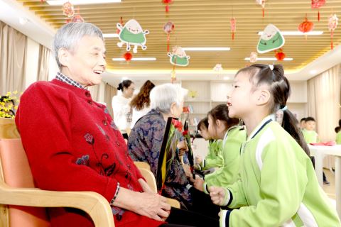 10日,在浙江省湖州市德清县武康街道群安社区示范型居家养老照料中心,远望幼儿园的小朋友为老人敲腿。