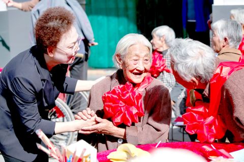 10日,在河南省焦作市博爱县许良镇许良村文化广场,志愿者为村里的老人戴上“长寿花”。