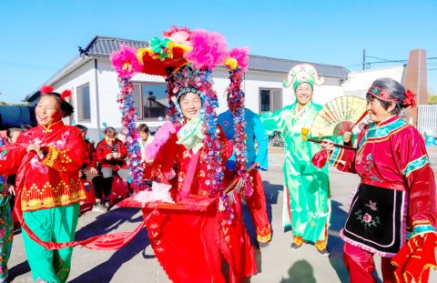 10日,河北省遵化市西下营满族乡的民间艺人在为老人们表演民俗节目。新华社 发