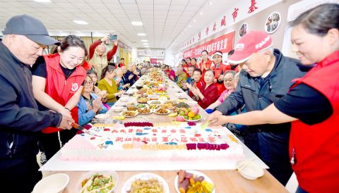 10日,在河南省洛阳市涧西区武汉路街道武汉路社区“银发宴”重阳节活动上,志愿者为老人集体祝寿过重阳。