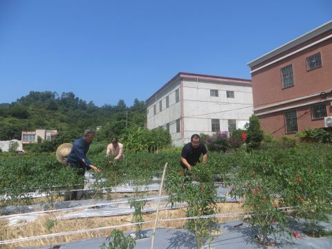 深秋时节,正是蔬果成熟的好季节,在上林村这片热土上,硕果累累。上林村村委会右边是面积28亩的朝天椒种植园,秋天的艳阳挥洒在一株株朝天椒上,绿叶红椒映衬得格外醒目。林俊城与几位乡亲利用中午饭后空闲时间,到园里察看朝天椒长势,每株朝天椒上都长满了几十条果实,有的已经红透了,有的青翠欲滴。看着眼前的丰收场景,林俊城介绍,这片朝天椒种植园是今年5月引进的产业项目,共有28亩,目前已进入收摘期,预计到11月上旬将全部收摘完成,到时预计每亩地可以收摘8000斤。“目前,我们村委会已经与有关农产品公司签订销售协议,保底价是每市斤不低于3元。”林俊城掰着手指头说。