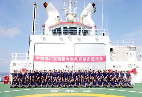 北京时间11月6日8时50分,正在执行中国第41次南极考察任务的“雪龙2”号穿越赤道进入南半球。此前,“雪龙”号已于5日驶过赤道。考察队在“雪龙”号和“雪龙2”号分别举行了穿越赤道纪念活动,以简单而热烈方式告别北半球,继续向南极挺进。图为考察队队员在“雪龙2”号上合影留念。新华社 发