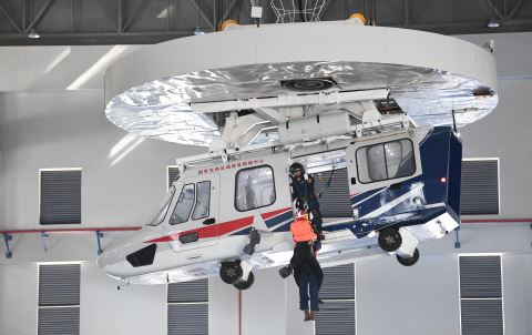 下图:11月18日,在国家东南区域应急救援中心的台风综合模拟救援训练馆,人员进行航空救援适应性训练。新华社 发