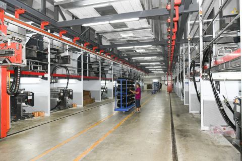 拥有国内外500多项专利技术的广东海兴控股集团,成功建设智能全流程5G数智工厂,通过使用智能自动化生产技术,如中央供料、自动堆叠、自动贴标、自动封箱、无人搬运车(AGV)等,提高生产效率和机台产能,降低能耗和人工成本,不仅提高产品的竞争力,也带动产业链上下游数智化转型。