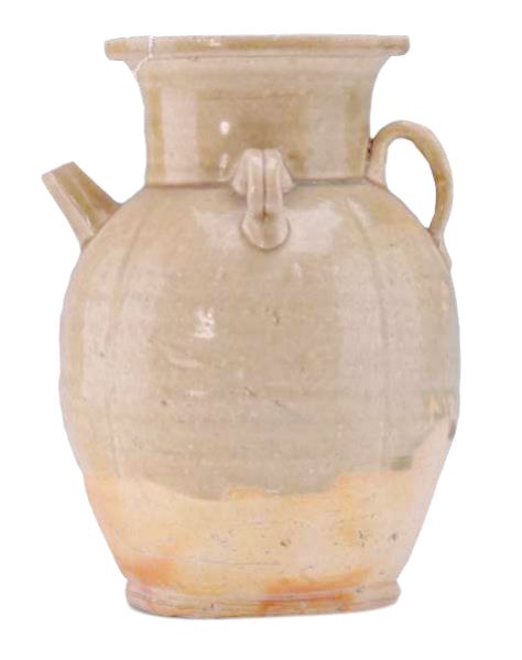 揭东区曲溪戏院出土。灰白色瓷胎。敞口、翻唇,颈微束,溜肩,鼓腹,饼足。肩附六棱形短流和两耳,肩颈间安短把。腹部压四瓜棱纹。器表施青釉过半,近底处露胎。制作精工,造型艺术风格秀雅,釉色美观亮泽。