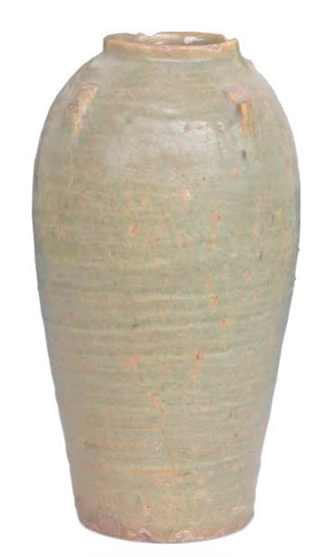 侈口,短颈,溜肩,深弧腹,下腹渐收,平底。肩附四耳。通体施青釉。器形清秀,釉色均匀青翠。此器属水车窑。