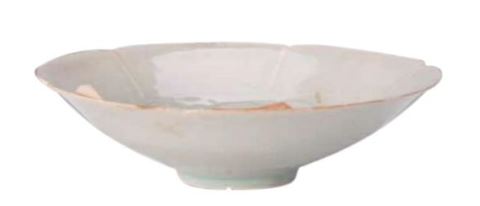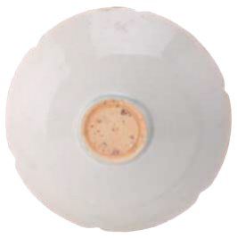 白瓷胎,胎较薄。为六出筋瓣口,腹弧收,中部有折棱,矮圈足。内底划花卉纹。通体施浅青釉。造型精美,纹饰活泼,釉色均净透明。
