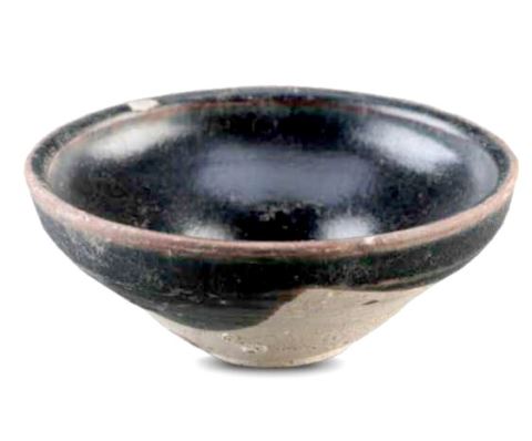 宋人善斗茶,茶色贵白,黑釉碗宜于比试。此碗敞口,圆唇,斜直壁,小圈足。施黑釉,里满釉,外釉不到底。釉色较润泽,内口沿下有一圈金兔毫,为宋代最流行的建窑兔毫碗优良品种。 |