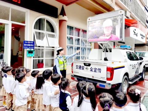 活动中,民警结合PPT课件和宣传展板向小朋友们讲解交通安全知识,帮助他们掌握如何安全过马路、如何乘车、如何安全避免事故发生等常识,让小朋友们了解各类交通违法行为的危害性和安全出行的注意事项。同时,组织小朋友开展交通安全知识有奖问答活动,使他们在轻松愉悦的氛围中学到“不闯红灯”“马路上不乱跑”“使用儿童安全座椅”“一盔一带”等基本防护知识。学习完理论知识后,小朋友们开启了交通安全知识模拟体验之旅,在酒醉驾体验区、警用摩托车展示区、校车盲区体验等多个交通安全体验区轮流参加活动。此外,民警还通过现场示范正确佩戴安全头盔、播放摩电道路交通事故教育警示片、分发宣传资料等方式宣传交通安全知识(见图。通讯员 摄)。