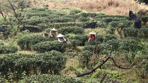 工人们穿梭在茶树间,熟练地采摘着嫩绿的茶叶。周浩航 摄