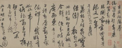 作品创作于永乐八年(1410),时解缙42岁,恰从遥远的边陲入京奏事。此卷书法纵横超逸,奔放洒脱,点划出规入矩,绝无草率牵强处。章法经营尤见匠心,灵动自然、全篇一气呵成,上下牵丝引带、连绵致密,左右交相呼应,神气自备,显示出解缙驾驭长卷游刃有余的不凡功力。从卷末自识中流露出解缙本人对此卷也是颇为得意的。此帖行笔露锋凌厉,笔速迅疾如飞,笔画浑朴与轻盈结合,墨色枯润相济。以“风”“开”“年”等字为例,饱满自然、转折婉转,笔画纵逸洒脱、飞白连带酣畅淋漓。《自书诗卷》结字灵活多变,尤其是竖画多作飞白书,显得纵长,但细观之,其笔法、结字仍蕴藏法度,既有怀素、米芾的痕迹,还有章草笔意融入。他把这件得意之作送给祯期,祯期为解缙兄解纶之子,以书名,不失门风。幅后有明王穉题跋一则。钤诸家鉴藏印共25方。