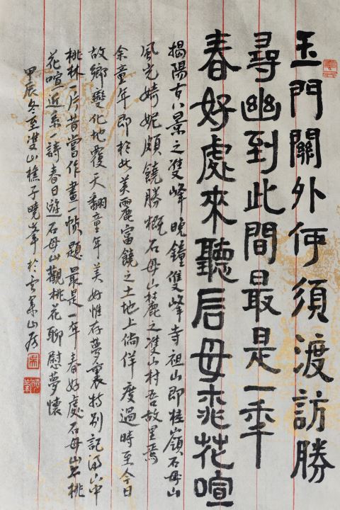 揭阳古八景之双峰晚钟双峰寺,祖山即桂岭石母山,风光旖旎,颇饶胜概。石母山麓之双山村,吾故里焉。余之童年即于此美丽富饶之土地中徜徉度过。时至今日,故乡变化地覆天翻,童年美好惟存梦里。特别记得山上桃林一片,尝作画一帧,题“最是一年春好处,石母山上桃花喧”。近系一诗《春日游石母山观桃花》,聊慰梦怀。